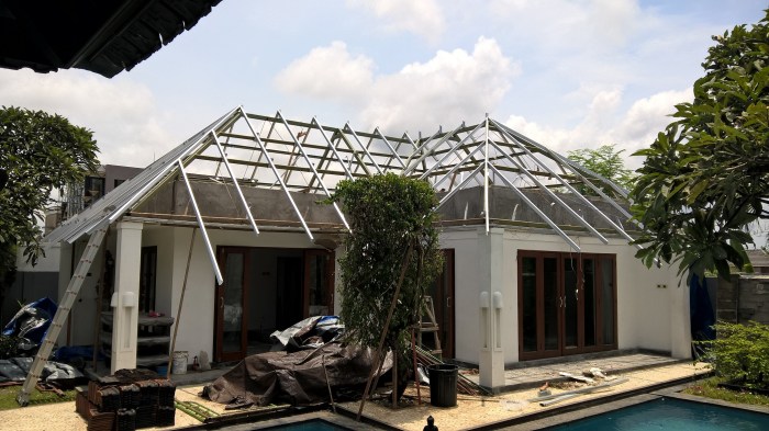 Proyek renovasi villa yang menggunakan rangka atap kombinasi baja berat (CNP) dan kayu. Kuda-kuda dan gording menggunakan baja berat CNP100. Usuk dan reng menggunakan baja ringan.