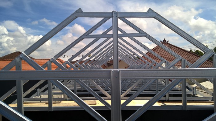 Proyek renovasi villa yang menggunakan rangka atap kombinasi baja berat (CNP) dan kayu. Kuda-kuda dan gording menggunakan baja berat CNP100. Usuk dan reng menggunakan baja ringan.